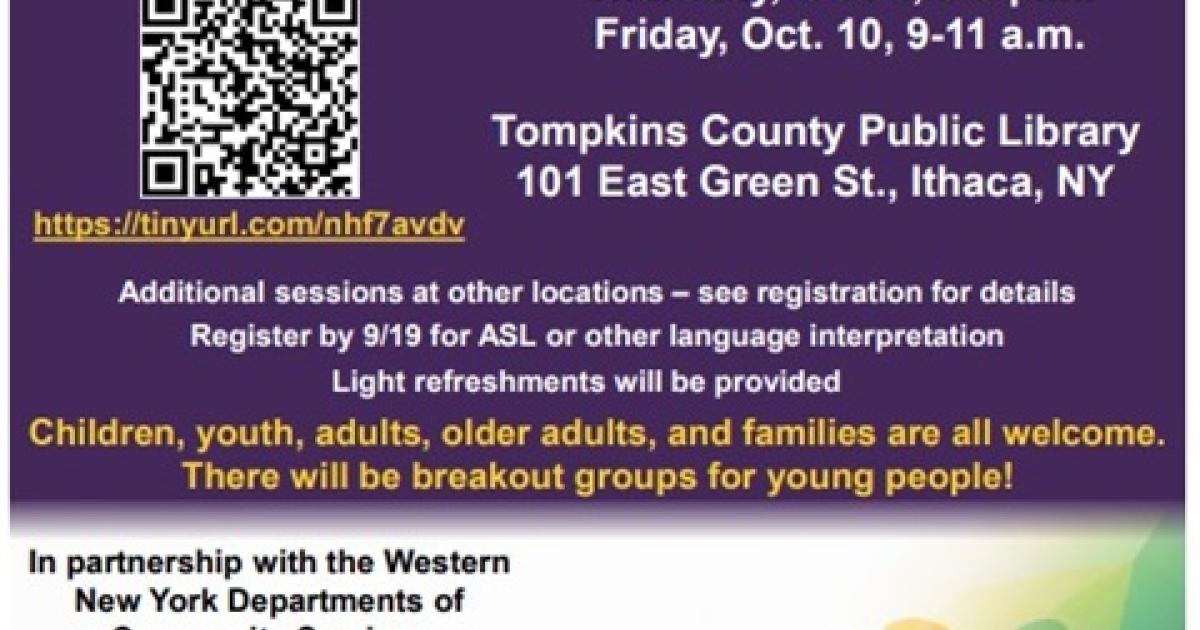 Tompkins County Whole Health (TCWH) invites the community to attend a Community Engagement Session with New York State Office of Mental Health (NYS OMH). These events are free and open to the public; light refreshments will be served. ASL interpretation will be provided. Please register in advance for any additional accessibility needs, including but not limited to assisted listening devices, ASL interpretation, interpretation in another language, and mobility assistance.