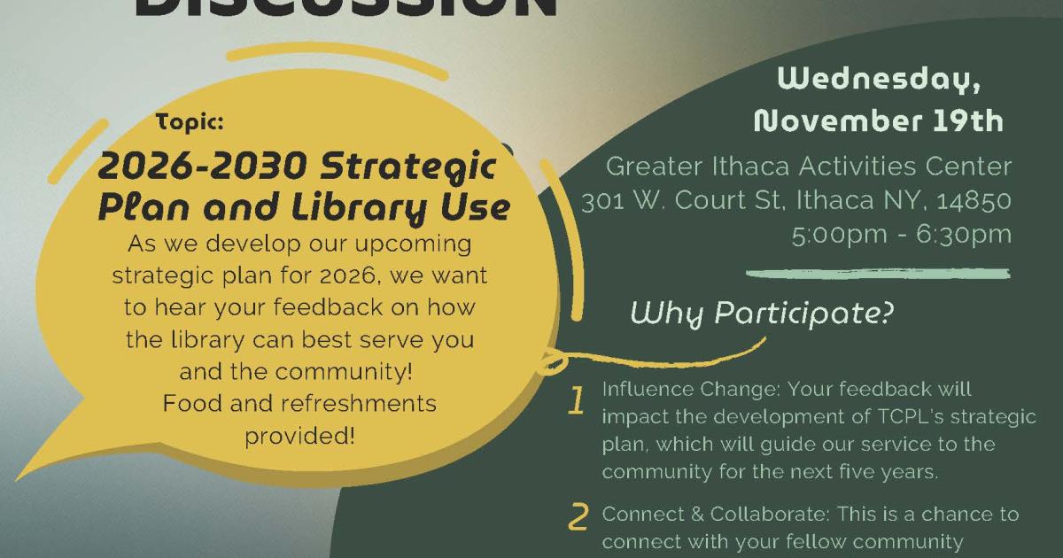Tompkins County Public Library invites you to a focus group discussion on the 2026-2030 Strategic Plan and Library Use. As we develop our upcoming 5-year strategic plan, we want to hear feedback on how the library can best serve you and the community!