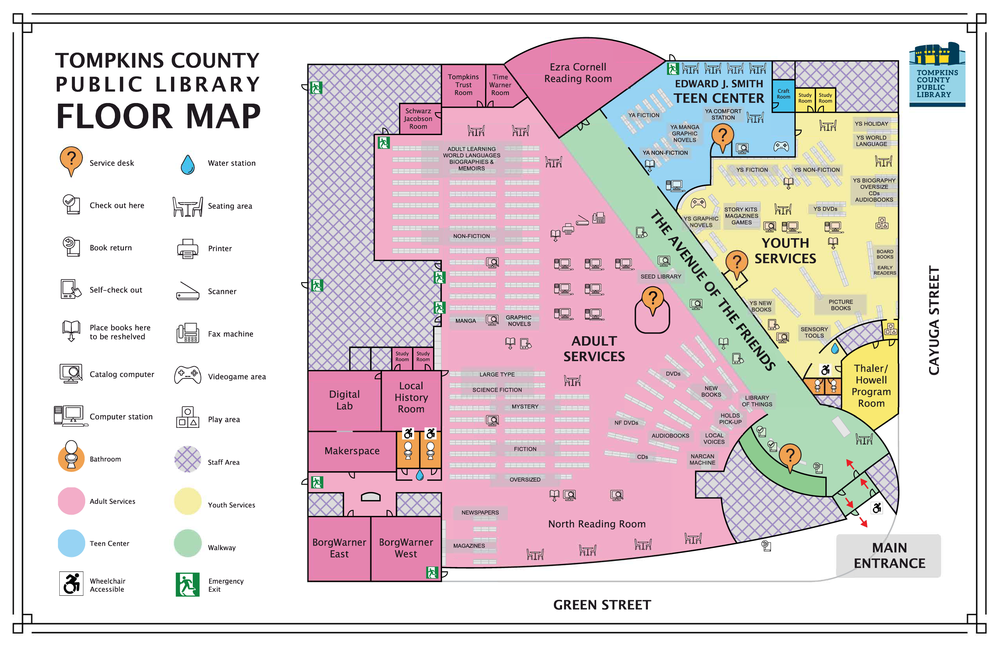 Tompkins County Public Library contains more than 60,000 square feet of space that includes the Library's entire print collection, as well as specialized areas for adults, children, and teenagers. The Library also includes study rooms, programming space, community rooms along with the Digital Lab, Makerspace, and Local History Room.